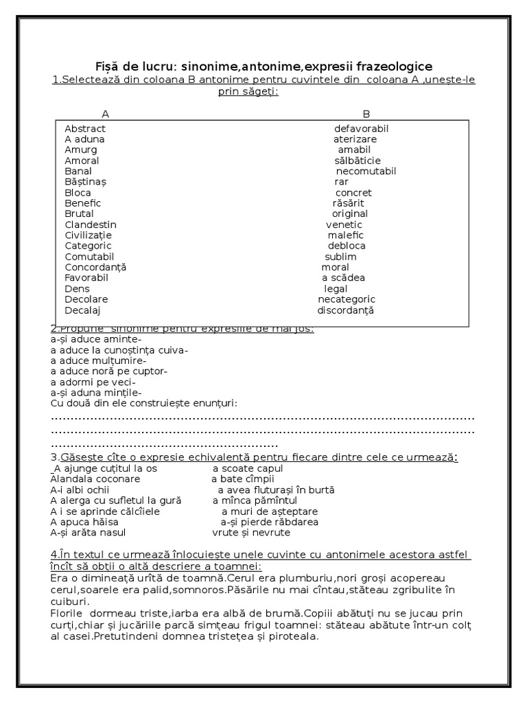 Sinonime Antonime Fisa De Lucru Clasa A Vii A Doc