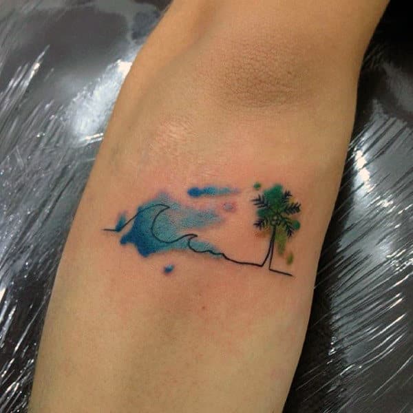 Tatuaje De Aspecto Dulce Y Color Muslo De Palmeras Con Sol Y Ola Tattooimages Biz