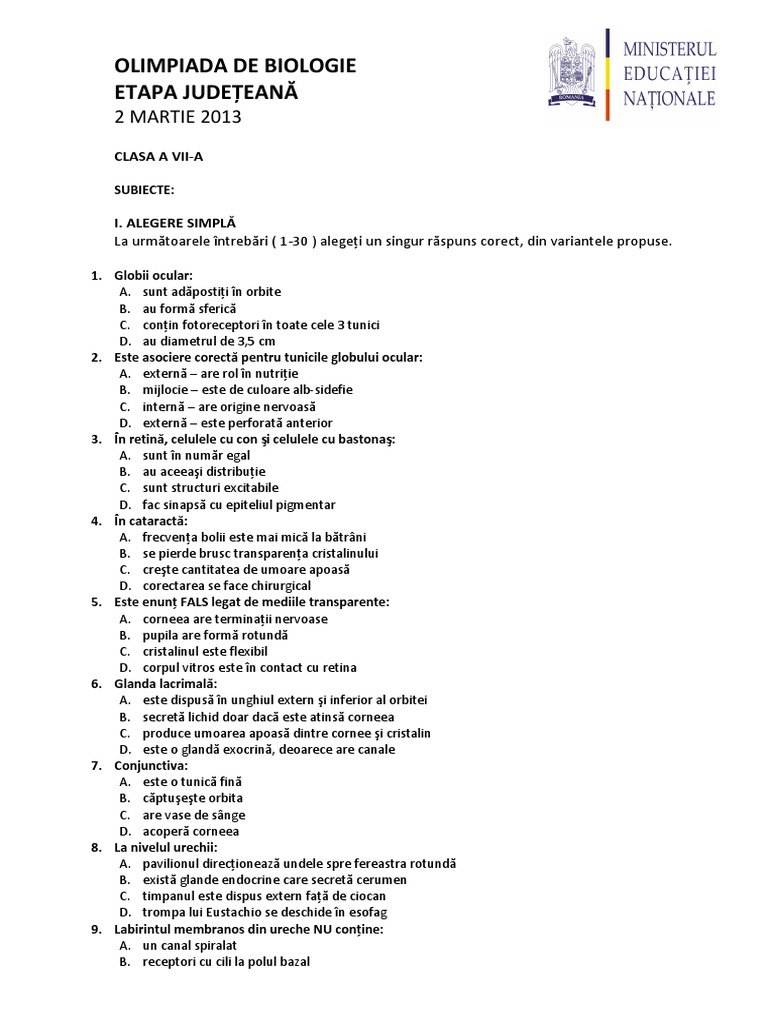 Olimpiada De Biologie Clasa A Vii A Subiecte Si Bareme 2014