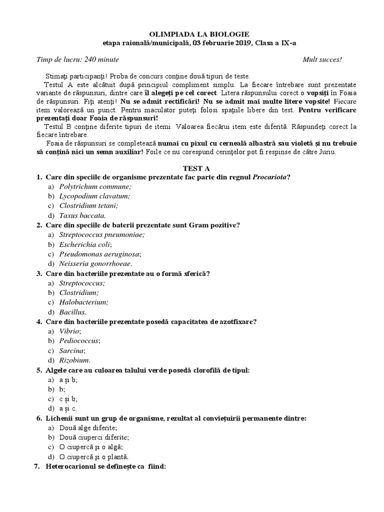 Olimpiada Judeteana De Biologie Clasa A 7 A Subiect Barem