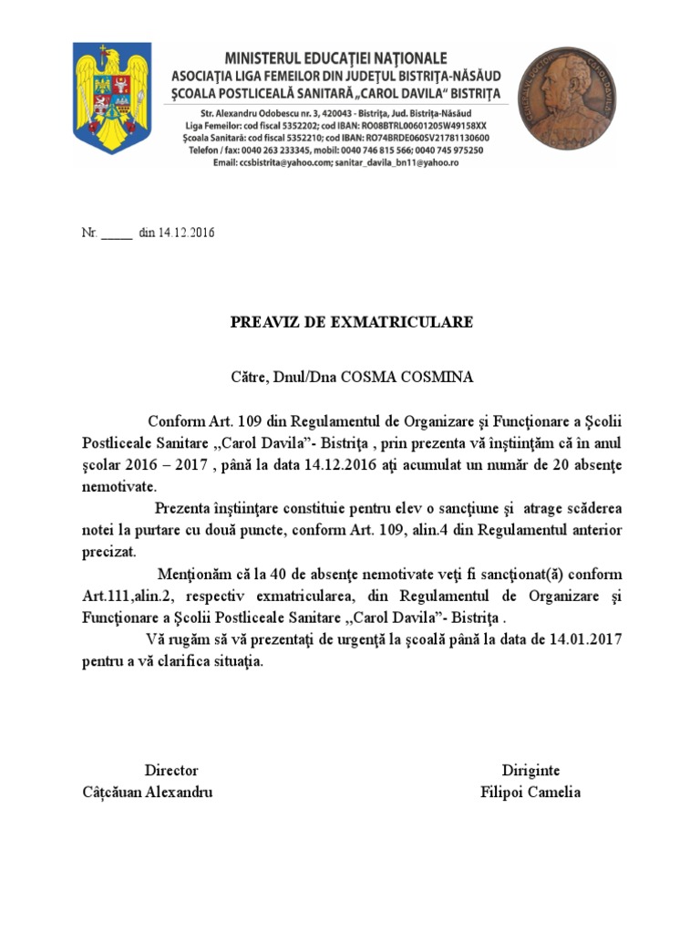 Preaviz Exmatriculare Imprimate Scolare Imprimate Scolare