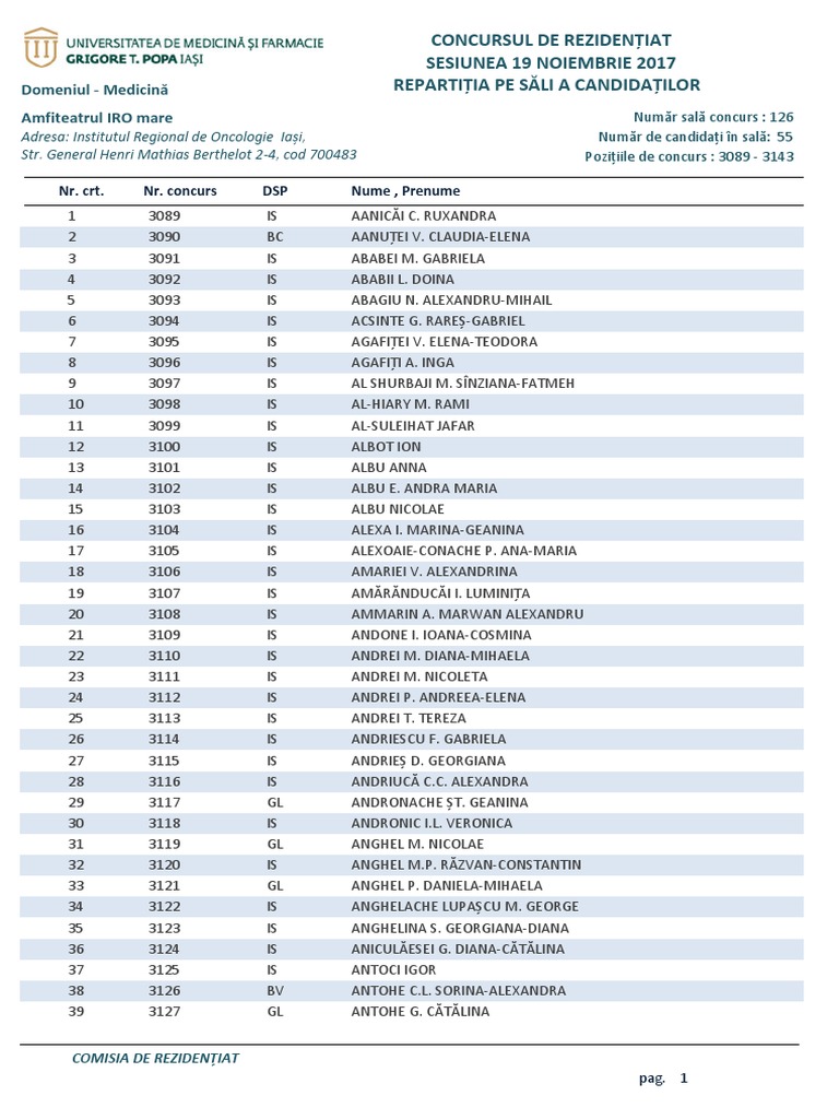 Candidații admiși la examenul de rezidențiat în 2017 își aleg locurile posturile posturile în specialitatea pentru care au optat duminică și luni a informat un comunicat al ministerului sănătății. Cosmin coloana mg1 8 3921. Hunor coloana mg1 5 3918 m achim a. Repartitia pe sali a candidatilor inscrisi la concursul de rezidentiat sesiunea 25 noiembrie 2012 candidatii vor fi prezenti duminica 25 noiembrie 2012 ora 8 30 la salile la care au fost repartizati avand asupra lor un act de identitate.