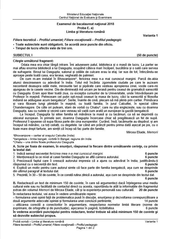 Subiecte Bac Romana 2018 Toamna